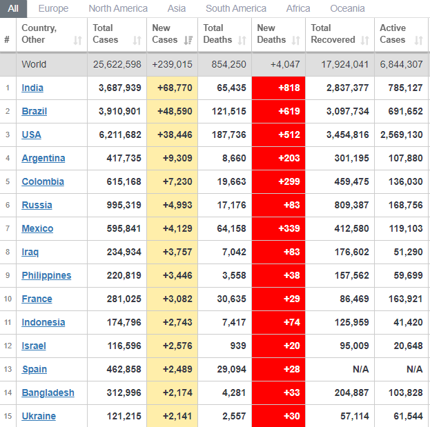 Деталі: Найбільше нових заражень зафіксували в Індії – 68 тисяч. У Бразилії виявили 48,5 тисяч випадків, в США – більше 38 тисяч, в Аргентині – понад 9 тисяч.