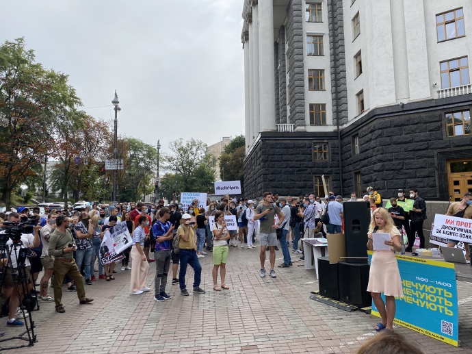 В руках у протестувальників плакати: "Нас не чують", "Карайте винних, а не всіх підряд", "Ми проти дискримінації", "Кабмін, не порушуй конституцію".