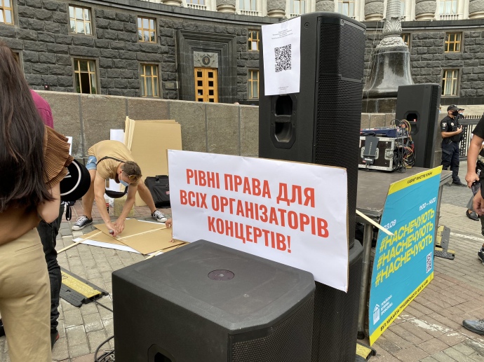 Біля будівлі Кабінету міністрів проходить мітинг представників музичної індустрії в знак протесту проти рішень уряду про часткову заборону на проведення концертів організаторами, у яких відповідний класифікатор видів економічної діяльності не є основним.
