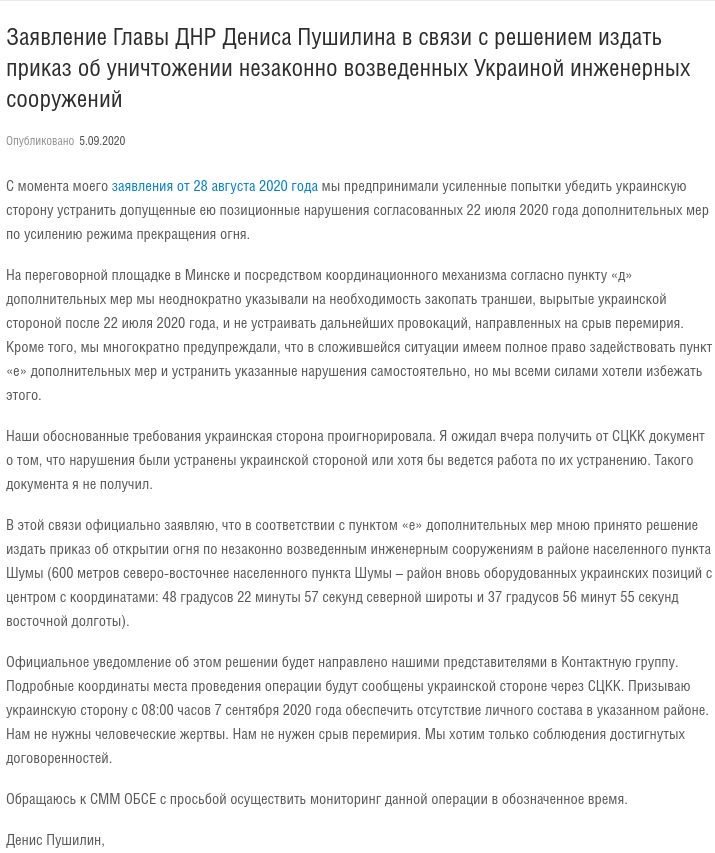 Пряма мова: "Офіційно заявляю, що відповідно до пункту "е" додаткових заходів мною прийнято рішення видати наказ про відкриття вогню по незаконно зведеним інженерним спорудам в районі населеного пункту Шуми (600 метрів на північний схід від населеного пункту Шуми - район обладнаних українських позицій з центром з координатами 48 градусів 22 хвилини 57 секунд північної широти і 37 градусів 56 хвилин 55 секунд східної довготи). Закликаю українську сторону з 8 години 7 вересня 2020 року забезпечити відсутність особового складу в зазначеному районі. Нам не потрібні людські жертви. Нам не потрібен зрив перемир'я".