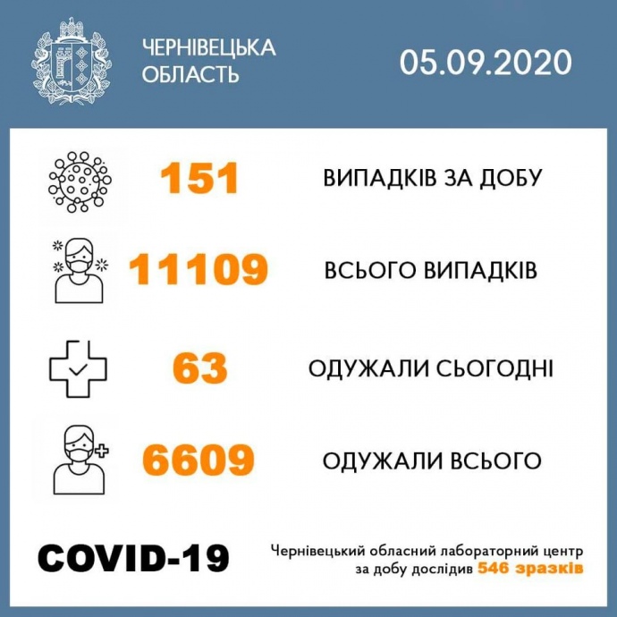 5 вересня в Чернівецькій області виявили 151 випадок зараження коронавірусом. Загалом від початку пандемії, COVID-19 діагностували у 11 тисяч мешканців області.