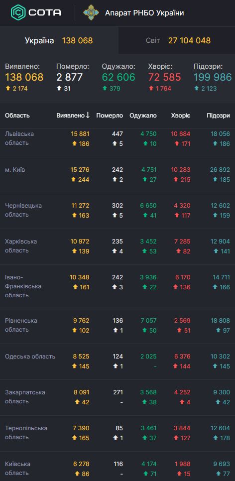 Загалом за час пандемії в Україні 138 068 осіб захворіли на коронавірусну хворобу COVID-19, із них 2 877 осіб стали її жертвами, 62 606 вже одужали. Зараз хворіють 72 585 жителів України.