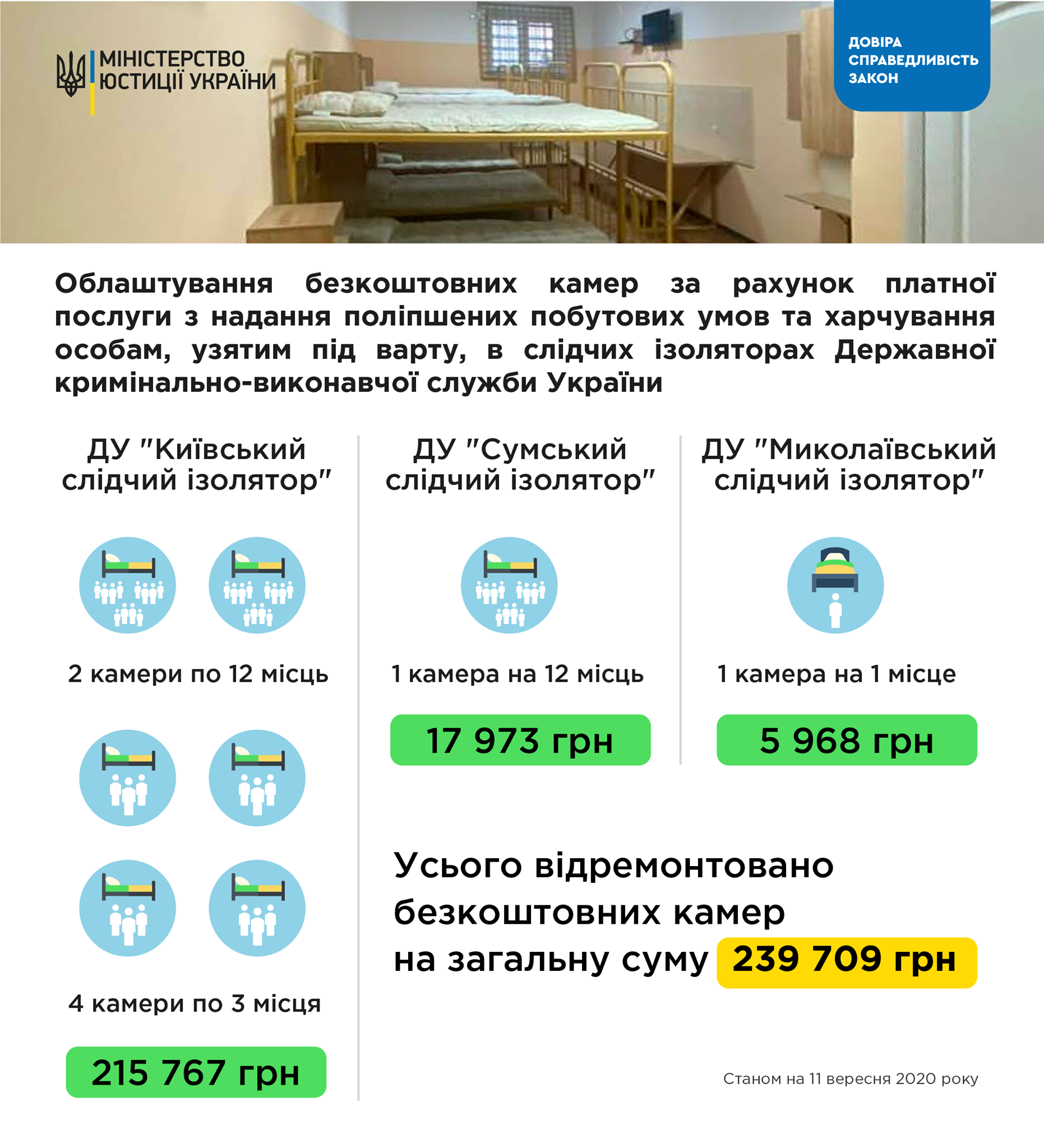 Протягом менше ніж 5 місяців Міністерство юстиції відремонтувало 8 камер в українських слідчих ізоляторах, і зробило це за кошти, які поступили від оренди платних камер з поліпшеними умовами проживання.