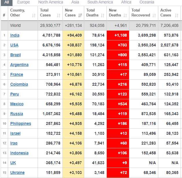 Загалом жертвами пандемії вже стали 924 тисячі осіб. Змогли побороти коронавірус 20,8 млн осіб. Активними залишаються 7,2 млн випадків коронавірусу.