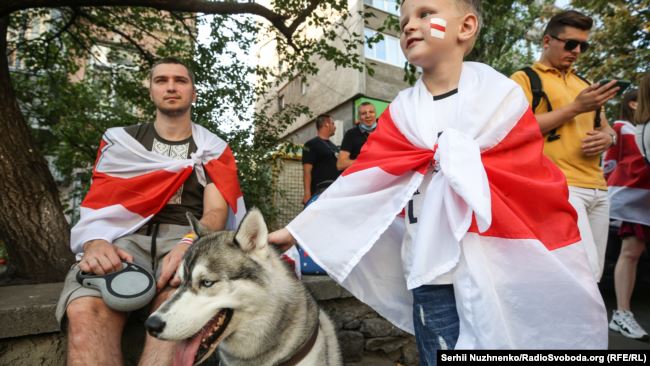 Учасники розгорнули великий стяг біло-червоно-білого кольору, який у Білорусі використовують учасники протестів, і пройшли маршем центральними вулицями Києва до посольства Білорусі.