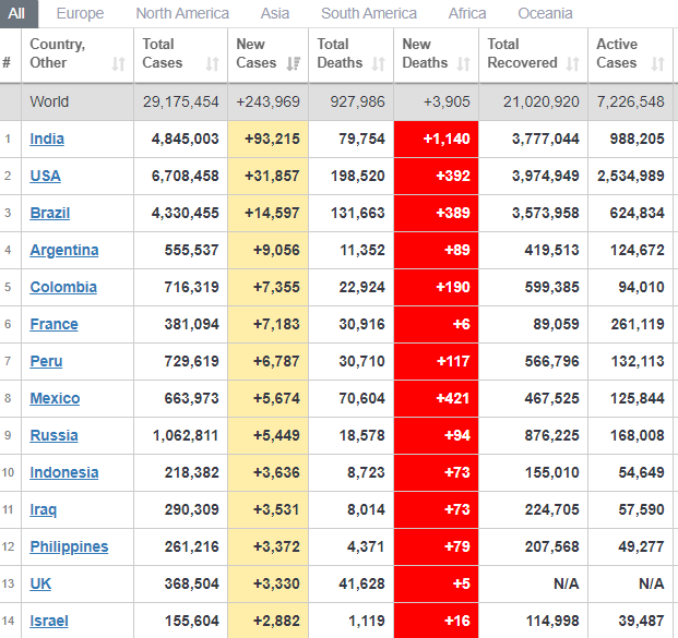 Загалом, за час пандемії, у світі зареєстрували 29,1 млн випадків коронавірусу.Змогли подолати недугу вже 21 млн. Ще майже 928 тисяч людей загинули внаслідок захворювання. Активними залишаються 7,2 млн випадків зараження.