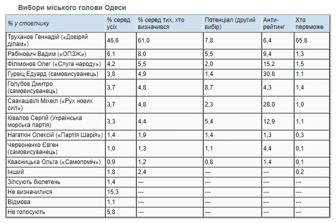 Труханов має і найкраще ставлення з можливих кандидатів (до нього позитивно ставляться 61,3% жителів Одеси, негативно – 15,6%). Далі за цим показником ідуть Голубов (33,2% проти 14,3%), Скорик (30,7% проти 18,1%) і Рабінович (32,5% проти 23,7%).