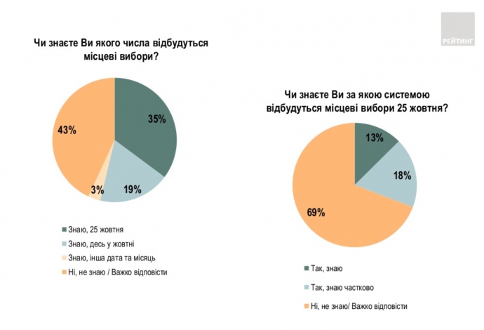 69% опитаних не знають, за якою системою відбудуться місцеві вибори 25 жовтня. Лише 13% впевнено відповіли, що знають, як відбуватиметься голосування, 18% зазначили, що знають про це частково. Відносно вищий рівень обізнаності про систему виборів демонструють старші опитані. Натомість серед наймолодшої вікової групи (18-29 років) майже 80% взагалі нічого не знають про систему виборів.