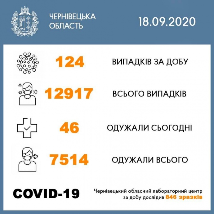 Станом на 18 вересня в Чернівецькій області COVID-19 діагностували у 12 917 людей. У "червоній" зоні залишаються Герцаївський та Кельменецький райони.