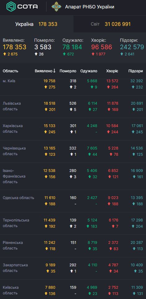 Загалом за час пандемії, тобто з початку березня, в Україні COVID-19 виявили у 178 353 осіб, із них 3 583 померли, а 78 184 одужали.