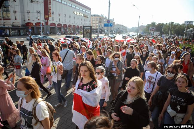 Вигукують також "Віддайте нашу Машу" (Марію Колесникову, соратницю Тихановської).