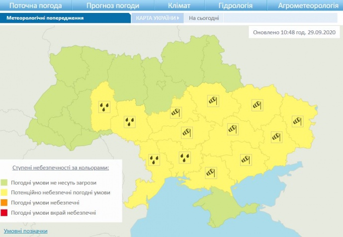 Дослівно: "Вдень 29 вересня у Хмельницькій, Вінницькій, Одеській, Миколаївській областях значні дощі; у південних, східних та центральних областях пориви вітру 15-20 м/с".
