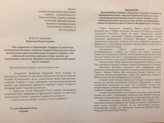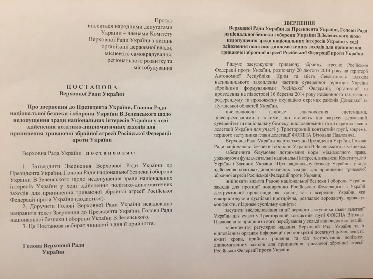 Дослівно текст звернення: "Засудити висловлювання та дії заступника голови делегації України у Тристоронній контактній групі Вітольда Фокіна та припинити його перебування у складі відповідної делегації".