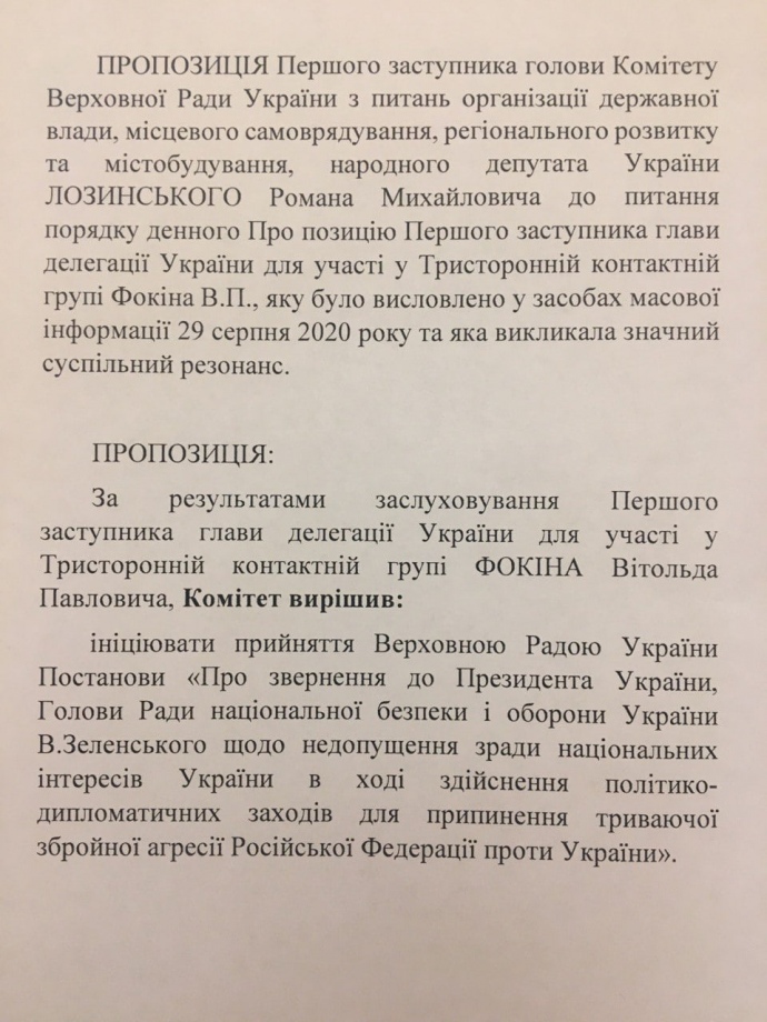 За результатами засідання комітет Верховної Ради з питань організації державної влади, місцевого самоврядування, регіонального розвитку та містобудування вирішив звернутися до президента Володимира Зеленського і рекомендувати звільнити першого заступника голови делегації України у ТКГ Вітольда Фокіна.