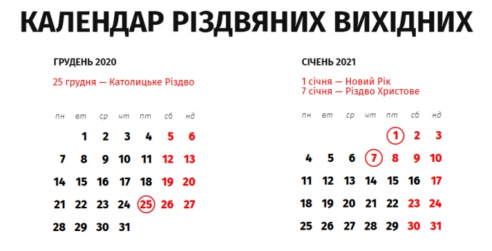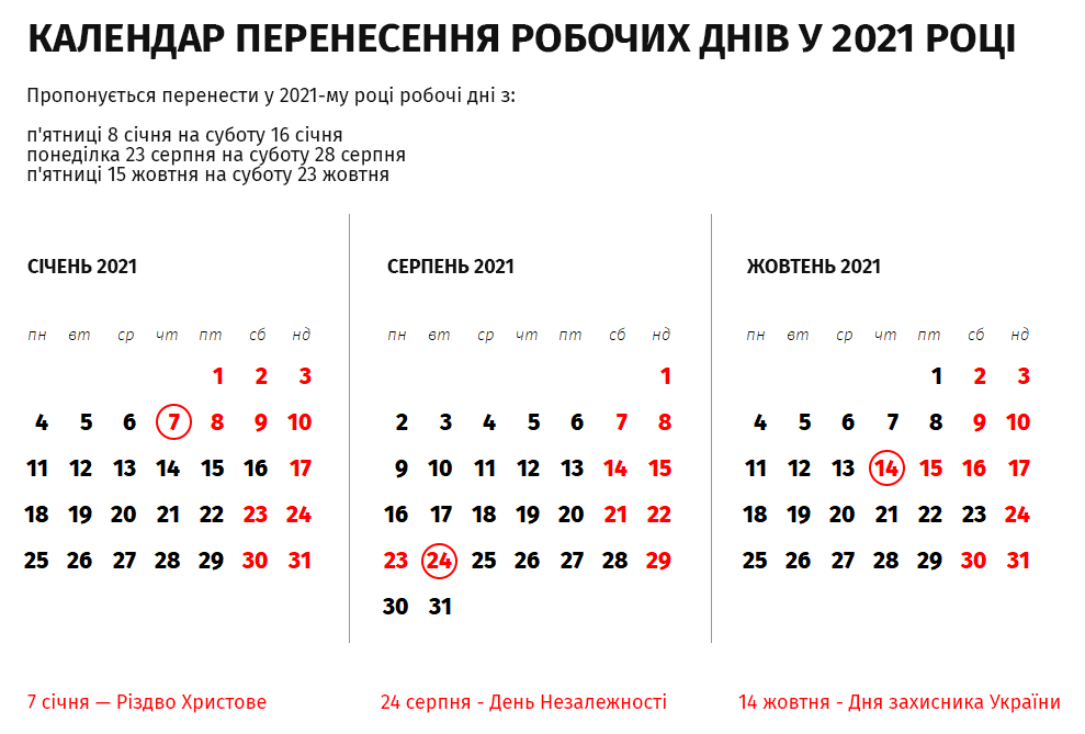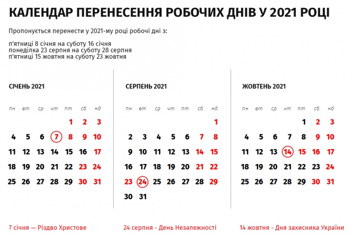 Кабінет міністрів переніс робочі дні у 2021 році з метою раціонального використання робочого часу та створення сприятливих умов для святкування Різдва, Дня незалежності та Дня захисника України.