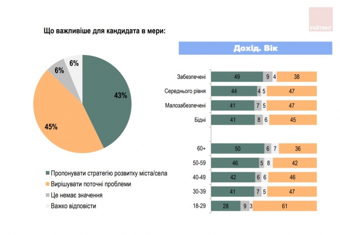 45% опитаних вважають, що для кандидата на міського/сільського голову важливіше вирішувати поточні проблеми. Водночас, майже стільки ж (43%) переконані, що йому важливіше пропонувати стратегію розвитку населеного пункту.
