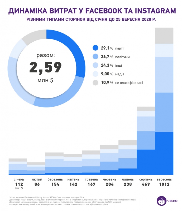 Дослівно: "Від 1 до 25 вересня на політичну рекламу у Facebook було витрачено понад 1 мільйон доларів (більш ніж 28 мільйонів гривень). Загалом же витрати на політичну та соціальну рекламу в українському сегменті соцмережі 2020 року перевищили 2,56 мільйона доларів".