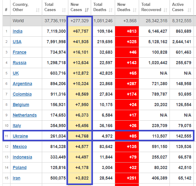 В країнах Європи лідерами антирейтингу з кількості нових випадків COVID-19 є Франція, Великобританія, Росія та Україна, яка займає 7 місце. У відповідному світовому антирейтингу Україна знаходиться на 11-му місці.