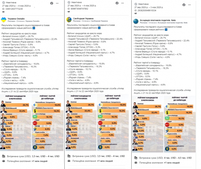 Зокрема, сторінки Свободная Украина та Асоціація платників податків. Київ, які два тижні тому поширювали фейкові опитування на користь Пальчевського, тепер звинуватили його у цьому та напророчили "крах на місцевих виборах".