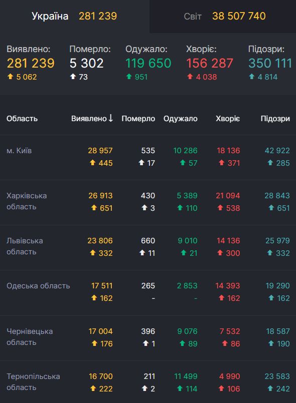 З усіх 281 239 хворих, виявлених із початку пандемії в нашій країні, 5 302 особи померли від ускладнень, а 119 650 осіб одужали.