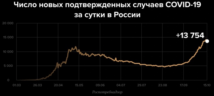 За минулу добу в Росії зафіксовано 13 754 нових випадків коронавірусної інфекції. Це на 497 менше, ніж днем раніше, коли вперше з початку пандемії в Росії була подолана позначка в 14 тисяч хворих за добу.