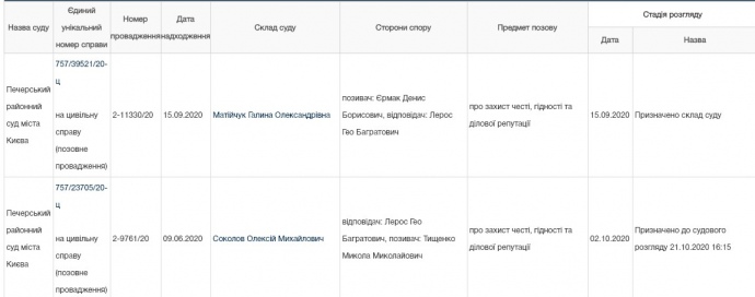 Справу за позовом Тищенка розглядатимуть за правилами загального провадження, а Єрмака - спрощеного, тобто без виклику сторін. Тищенко вимагатиме зобов'язати Лероса до якихось дій (ймовірно, мається на увазі спростування).