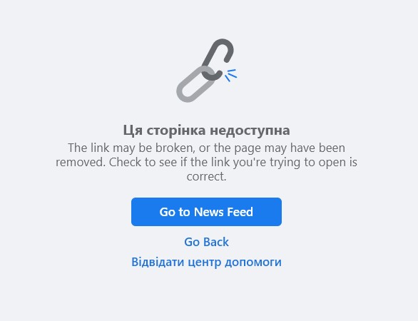 Дослівно: "Ми видалили цей обліковий запис і цю сторінку за порушення нашої політики щодо використання Facebook людьми, які беруть участь в операціях з надання впливу на вибори".