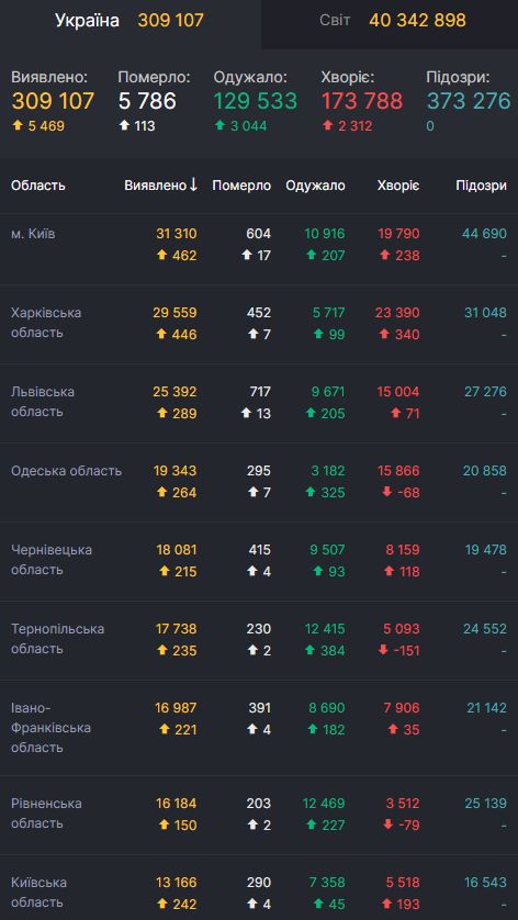 Із зафіксованих за час пандемії 309 107 хворих 5 786 осіб померли, 129 533 осіб одужали.