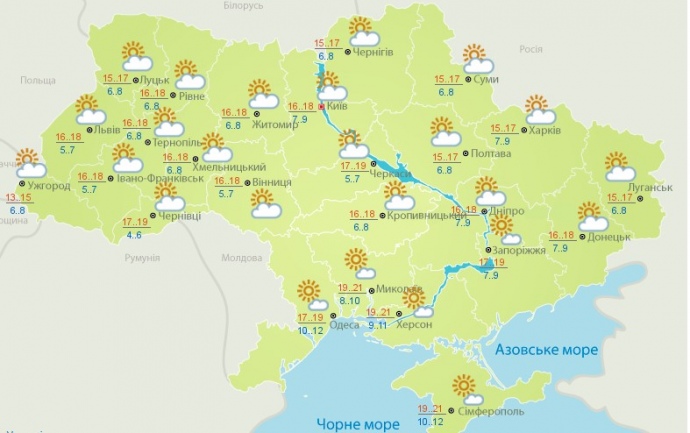 У п'ятницю по всій Україні - без опадів. Температура вночі 5-10°, вдень 14-19°, в південній частині до 22°; в Карпатах вночі близько 0°, вдень 6-11°.