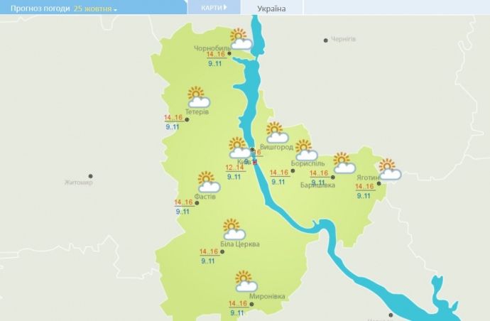 У Києві - без істотних опадів, вночі близько 10°, вдень від +12° до +14°, вітер північно-західний, 3-8 м/с, малохмарно.