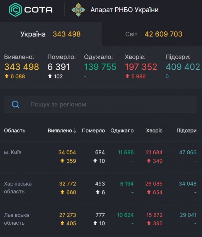 В Україні протягом суботи, 24 жовтня, виявили ще 6 088 випадків коронавірусу, 102 заражених померли.