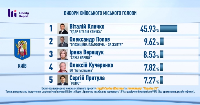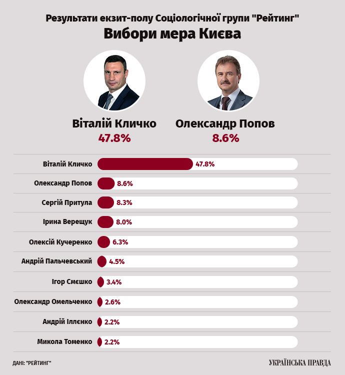 Згідно з екзит-полом служби "Рейтинг", Віталій Кличко з великім відривом випередив своїх конкурентів на виборах мера столиці, але до перемоги в першому турі не дотягнув.