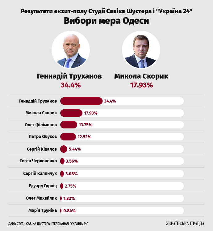 За даними екзит-полу Студії Шустера, за Труханова проголосовали 34,4%, Скорика – 17,93%, Філімонова – 13,75%.