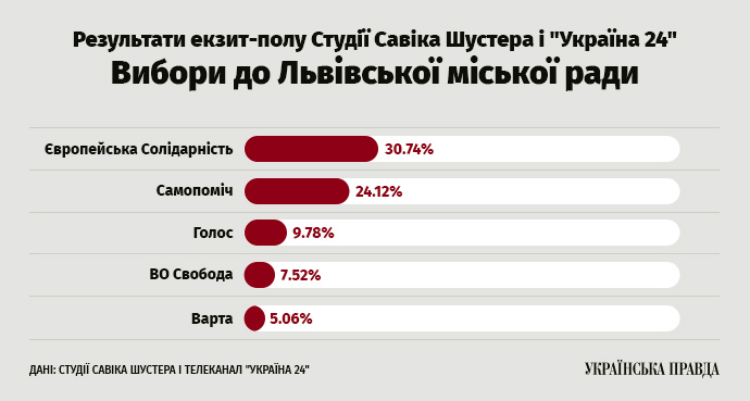 Довідка: Студія Савіка Шустера спільно з телеканалом "Україна 24" провели власні екзит-поли в 12 містах України: Києві, Харкові, Одесі, Львові, Дніпрі, Маріуполі, Кривому Розі, Чернівцях, Миколаєві, Вінниці, Черкасах та Ужгороді. Також були використані інструменти соціологічної компанії Liberty Report.