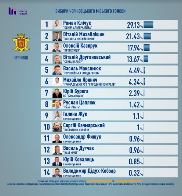 Нинішній мер Чернівців Олексій Каспрук отримав 17,94% голосів.