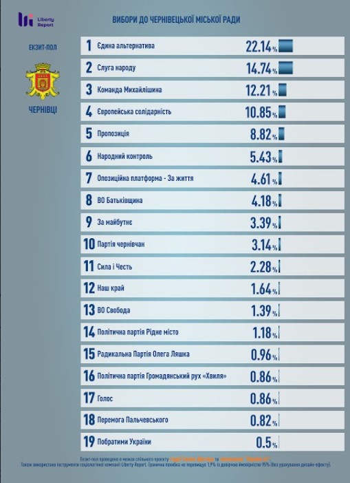 Другою є "Слуга народа" - 14,74%, "Команда Михайлішина" - 12,21%, "Європейська солідарність" - 10,86%, "Пропозиція" - 8,82, Народний контроль – 5,43%.