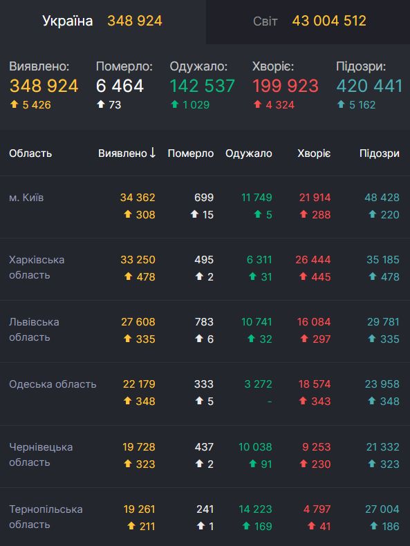 За добу 25 жовтня в Україні діагноз COVID-19 підтвердився у 5 426 осіб, 73 пацієнти померли, 1 029 хворих одужали, було госпіталізовано 736 людей.