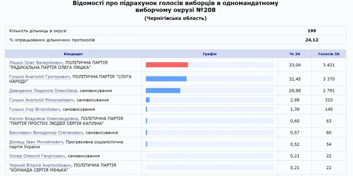 Деталі: За результатом підрахунку 24,12% дільничних протоколів на окрузі №208 у Чернігівській області Ляшко набирає 33,04% голосів виборців, а Гунько - 32,45%.