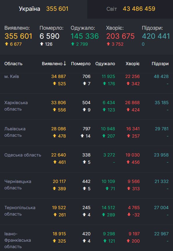 За добу 26 жовтня в Україні коронавірусну хворобу COVID-19 виявили у 6 677 осіб, було госпіталізовано 1 022 людини, померли 126 хворих, одужали 2 799 осіб.