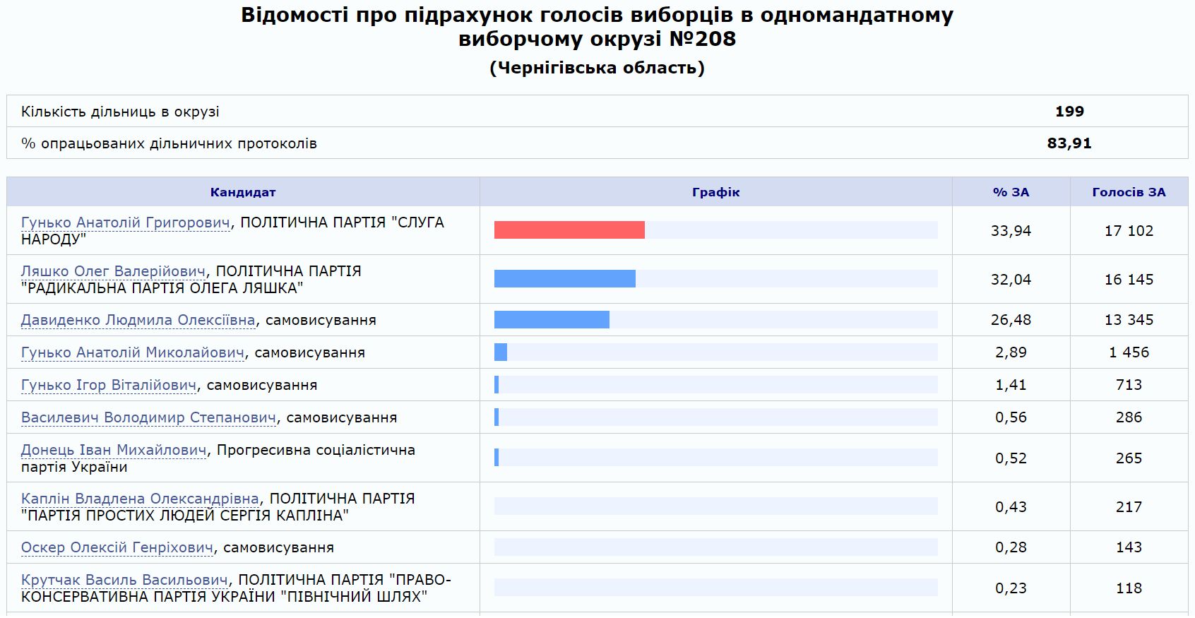 В одномандатному виборчому окрузі №208 у Бахмачі за результатом обробки 83,91% протоколів кандидат у народні депутати від "Слуги народу" Анатолій Гунько збільшує відрив від лідера "Радикальної партії" Олега Ляшка.