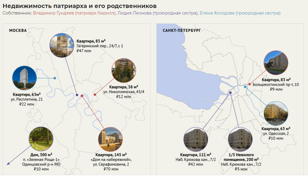 Глава Російської православної церкви патріарх Кирил і дві його троюрідних сестри володіють нерухомістю в Москві, Підмосков'ї і Петербурзі загальною вартістю майже 3 мільйона 270 тисяч доларів.
