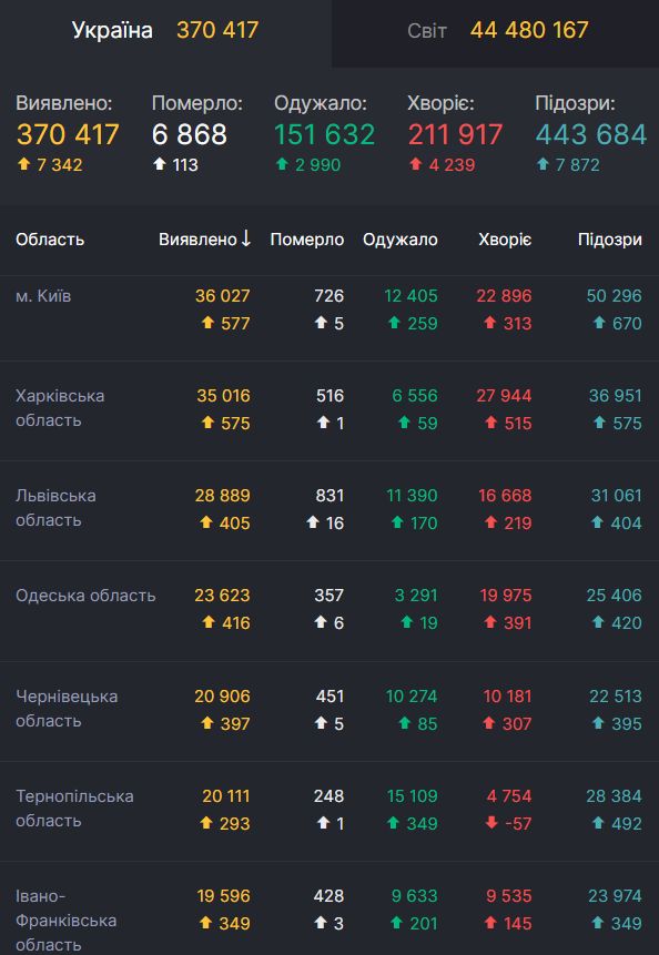 За весь час пандемії виявили коронавірус у 370 417 жителів України, померли від ускладнень 6 868 осіб, одужали 151 632 особи.