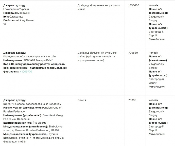 Журналісти вказують, що згідно з декларацією дружини-судді за 2019 рік, Завгородній отримав за рік 75 тисяч гривень пенсії від Пенсійного фонду в Москві (Завгородній - громадянин РФ), 1,8 мільйонів гривень від продажу меншої квартири і 700 тисяч гривень – від продажу авто.