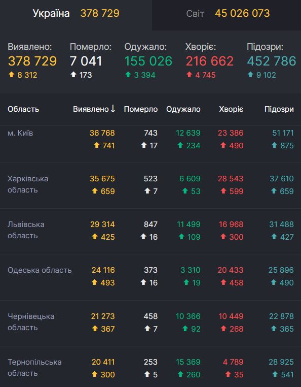 За весь час пандемії в Україні виявили 378 729 осіб із коронавірусом. 7 041 помер від ускладнень, 155 026 осіб одужали від коронавірусної хвороби.