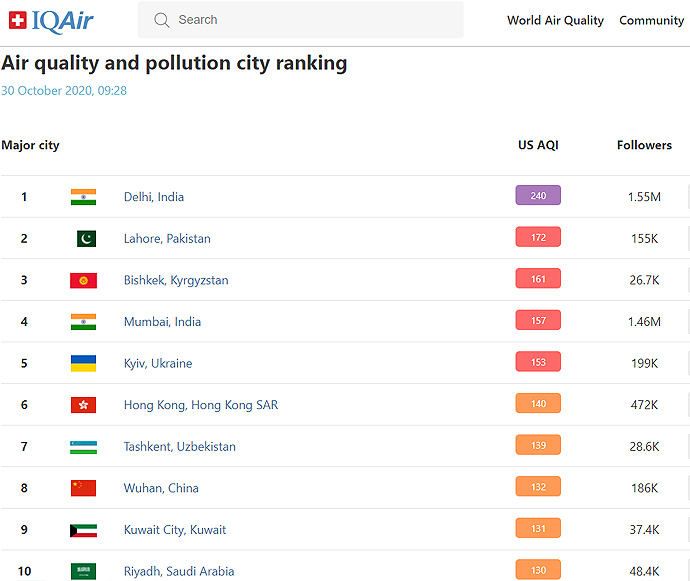 Наразі Київ випереджають в антирейтингу індійська столиця Делі, Лахор (Пакистан), Бішкек (Киргизстан) та Мумбаї (Індія).
