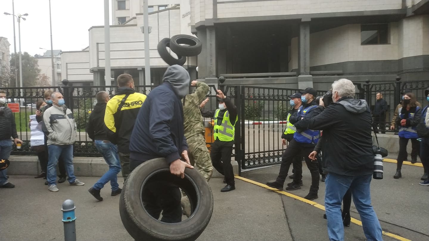 Група людей на чолі з активістом "Євромайдану" й колишнім нардепом Володимиром Парасюком закинула через паркан суду шини.
