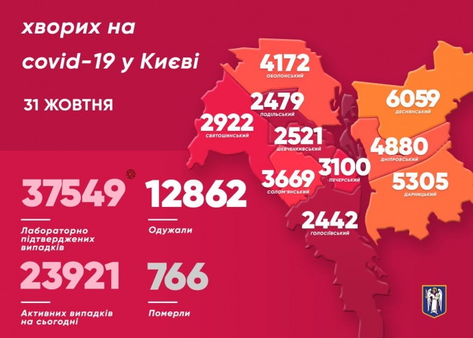Загалом у Києві вже 37 549 підтверджених випадків захворювання на COVID-19. Померли 766 киян, одужали – 12 862.