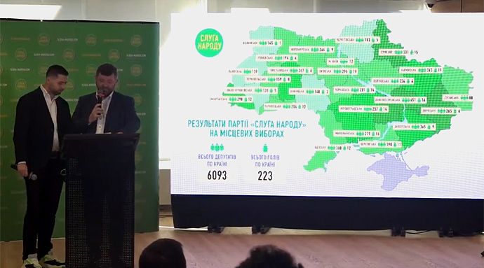 Пряма мова: "Партія "Слуга народу" виграла ці вибори за кількістю депутатських мандатів по країні. На карті ви можете бачити, які регіони більше зелені – там більше наших депутатів, які менш зелені – там менше, але в середньому менше 100 депутатів у нас тільки в Луганській області".