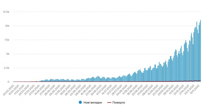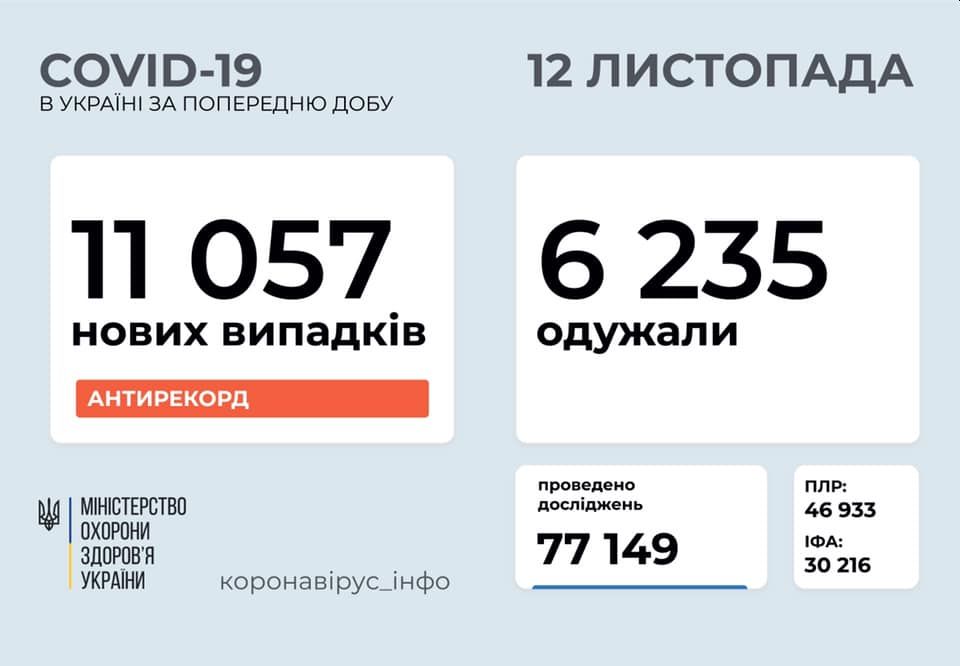 11 листопада в Україні було зафіксовано 11 057 нових випадків коронавірусної хвороби COVID-19, госпіталізовано 1 509 осіб, померли 198 осіб, одужали – 6 235 осіб.