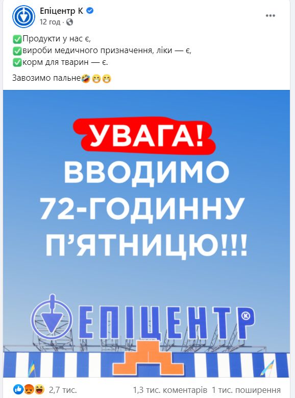 Після цього "Епіцентр" написав у Facebook: "Продукти у нас є, вироби медичного призначення, ліки - є, корм для тварин - є. Завозимо пальне". І додав картинку: "Увага! Вводимо 72-годинну п'ятницю!!!".